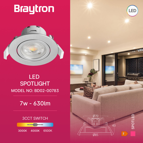 LED rozetna BD02-00783 u modernoj sivoj boji pruža usmereno svetlo sa izborom temperature (3000K, 4000K, 6500K). Snage 7W, jačine 630 lm, CRI >80 i dugog veka trajanja (20.000 h). Idealna za efikasno i precizno osvetljenje prostora, uz 2 godine garancije.