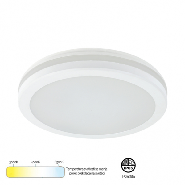 Led plafonska svetiljka u beloj boji, snage 30 W sa mogućnošću izbora boje svetla putem prekidača. Osim što je pogodna za korišćenje kao unutrašnja rasveta (u hodnicima, dnevnim sobama, trpezarijama, poslovnom prostoru), ova lampa zahvaljujući visokoj IP65 i IK08 zaštiti može se koristiti i u težim unutrašnjim ili spoljašnim uslovima, na mestima koji se izloženi vlagi, vodi, prašini (kupatila, autoperionice, perionice, garaže, podrumi).
