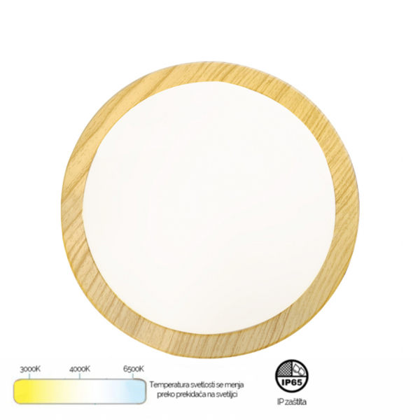 Prakticna i višenamenska LED plafonjera u u kombinaciji boje drveta i bele, snage 30W. Ova plafonjera poseduje birac boje svetla koji se nalazi sa zadnje strane, tako da možete izabrati boju svetla koja najviše odgovara vašim potrebama. Pored toga ovaj model poseduje i visok stepen IP 65 zaštite što ovu plafonjeru cini izdržljivom i upotrebljivom i u spoljašnjim uslovima i raznim vremenskim prilikama.