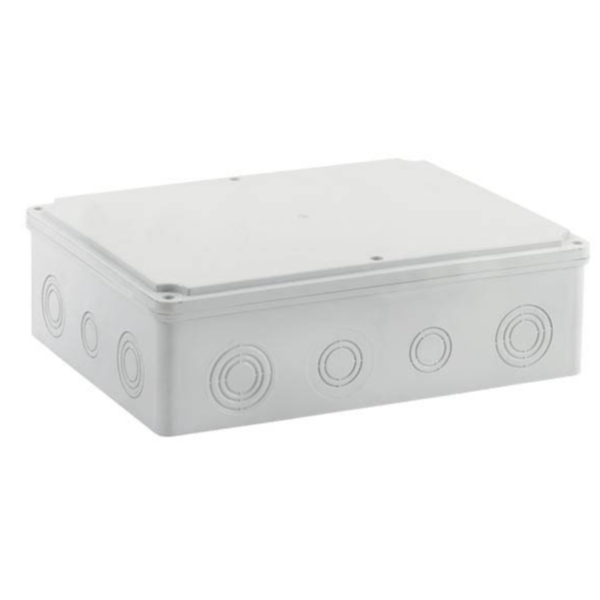Termoplastična ABS razvodna kutija sa neprovidnim poklopcem dimenzija 380 × 280 × 90 mm namenjena je za pouzdanu zaštitu elektro instalacija u stambenim, komercijalnim i industrijskim objektima. Izrađena je od kvalitetnog ABS materijala u sivoj boji (RAL 7035), sa nelomivom konstrukcijom i visokom otpornošću na mehanička opterećenja. Obezbeđuje siguran rad u temperaturnom opsegu od –40 °C do +80 °C, poseduje nerđajuće vijke, više izbijajućih otvora za lak i fleksibilan ulaz kablova, kao i odlično zaptivanje koje garantuje dug vek trajanja i maksimalnu sigurnost instalacija.