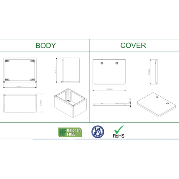 Elektro razvodna kutija od kvalitetnog ABS materijala sa metalnom osnovom od pocinkovanog lima debljine 0,80 mm i neprozirnim poklopcem, dizajnirana za pouzdanu zaštitu električnih instalacija. Pruža visok stepen zaštite IP65 i otpornost na udarce IK10, pogodna za unutrašnju i spoljašnju upotrebu. Dimenzije kućišta su 300 × 400 × 220 mm, u crvenoj bojii, sa plastičnim sistemom zaključavanja i radnim temperaturnim opsegom od -40°C do +80°C.